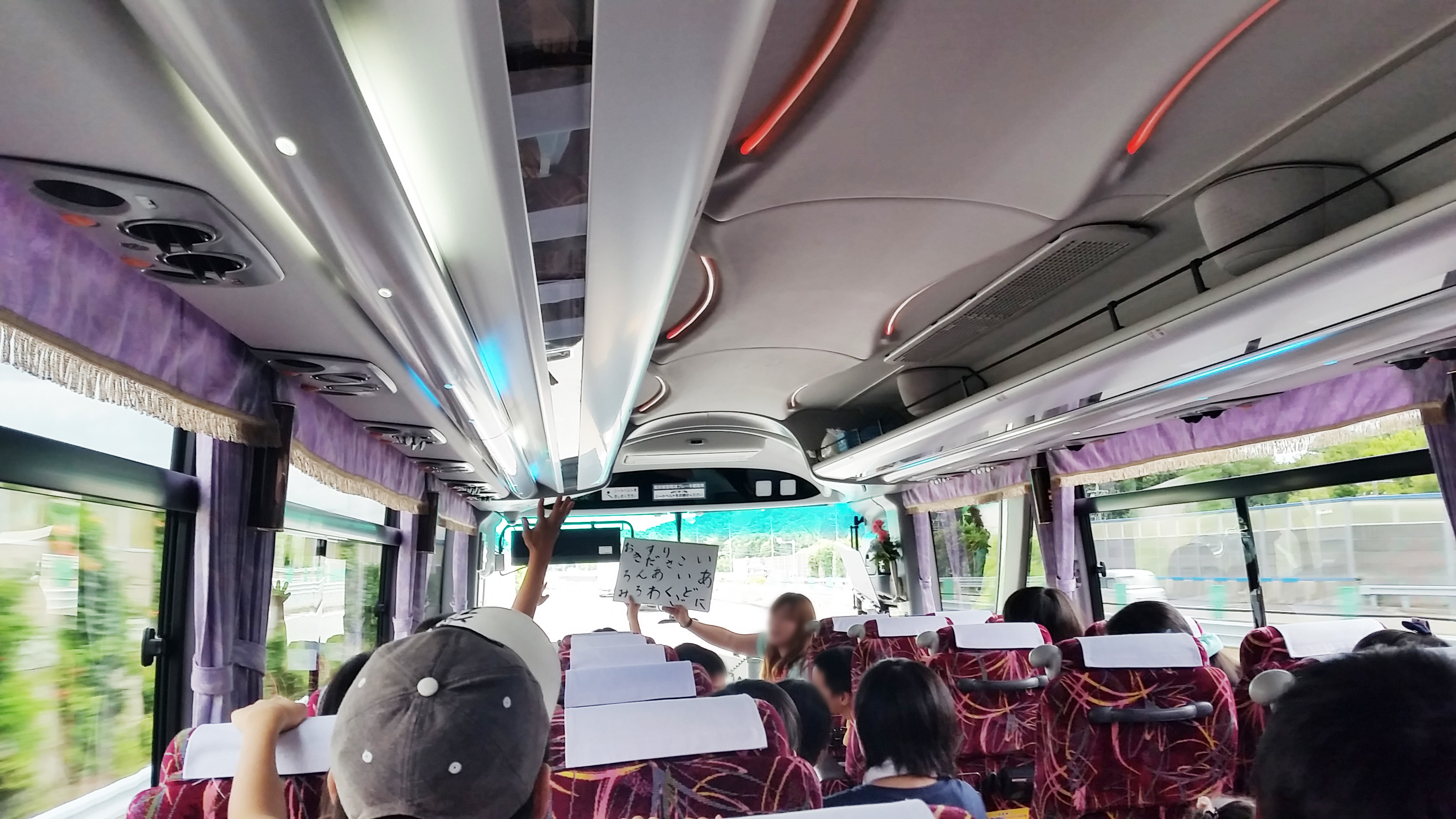大型バスに乗ってクイズやゲームなどのレクレーションを楽しみながらキャンプ場へ向かいました。