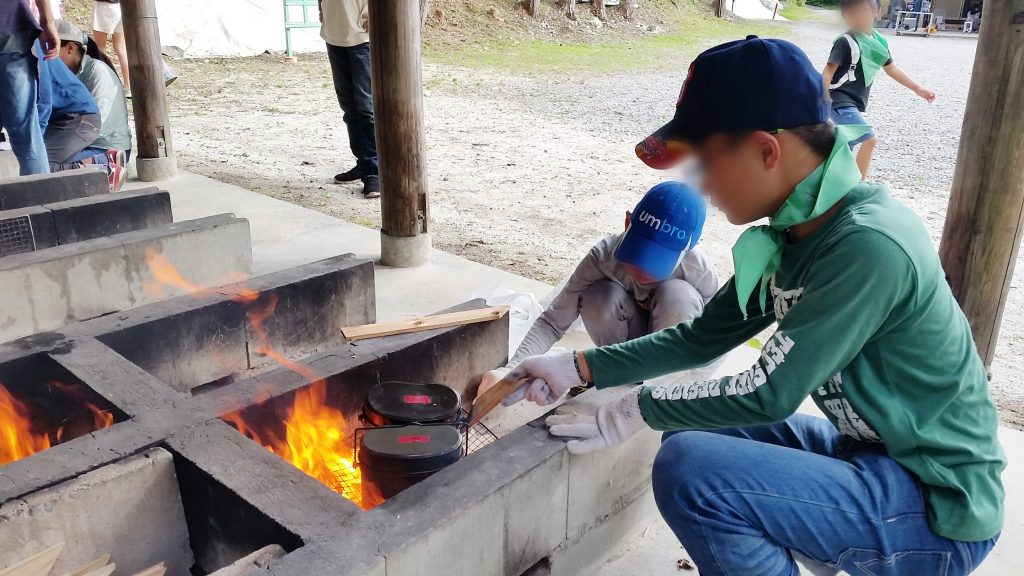火おこしをして飯盒炊爨とカレーの煮込みは高学年の担当。